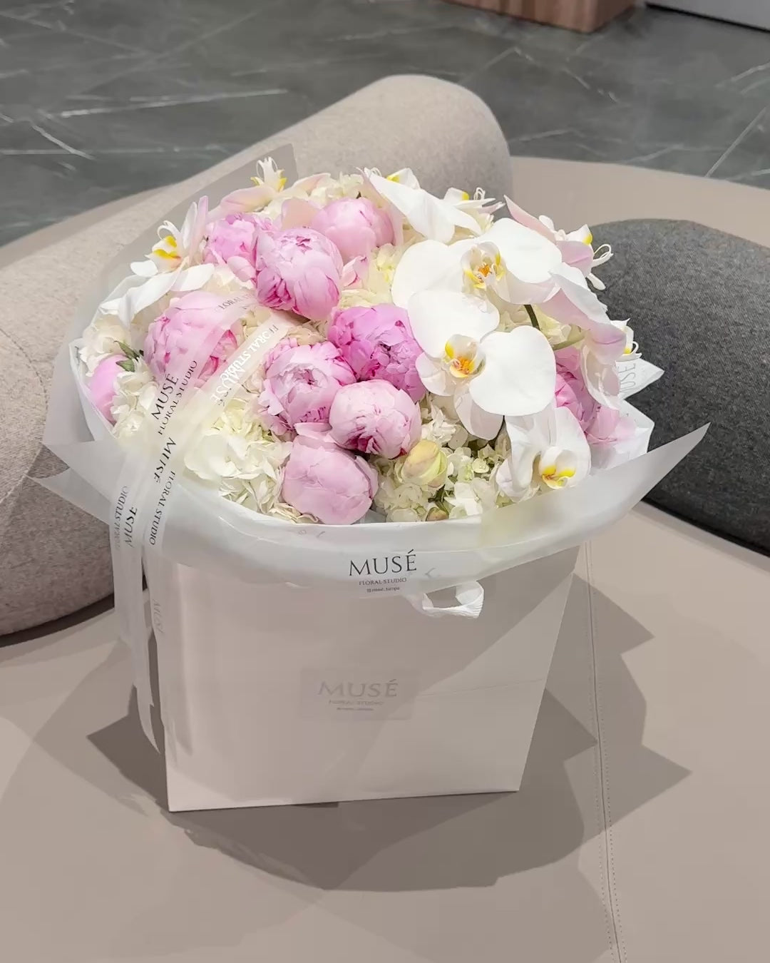 A breathtaking oversized bouquet featuring blush pink peonies paired with elegant white phalaenopsis orchids. The arrangement is wrapped in our signature Muse packaging with long satin ribbons for a refined, luxurious presentation.Soft, airy, and voluminous — the perfect statement bouquet for special occasions.