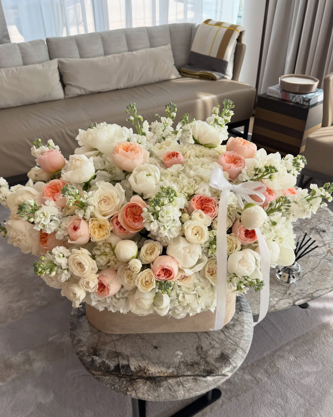 A statement floral arrangement in an oversized signature box, designed in soft ivory, blush, and champagne tones. Garden roses, ranunculus, hydrangeas, and delicate seasonal blooms are layered to create a lush, cloud-like composition with refined texture and volume. Elegant, abundant, and timeless, this arrangement is perfect for grand celebrations, luxury gifting, and moments that deserve something truly special.