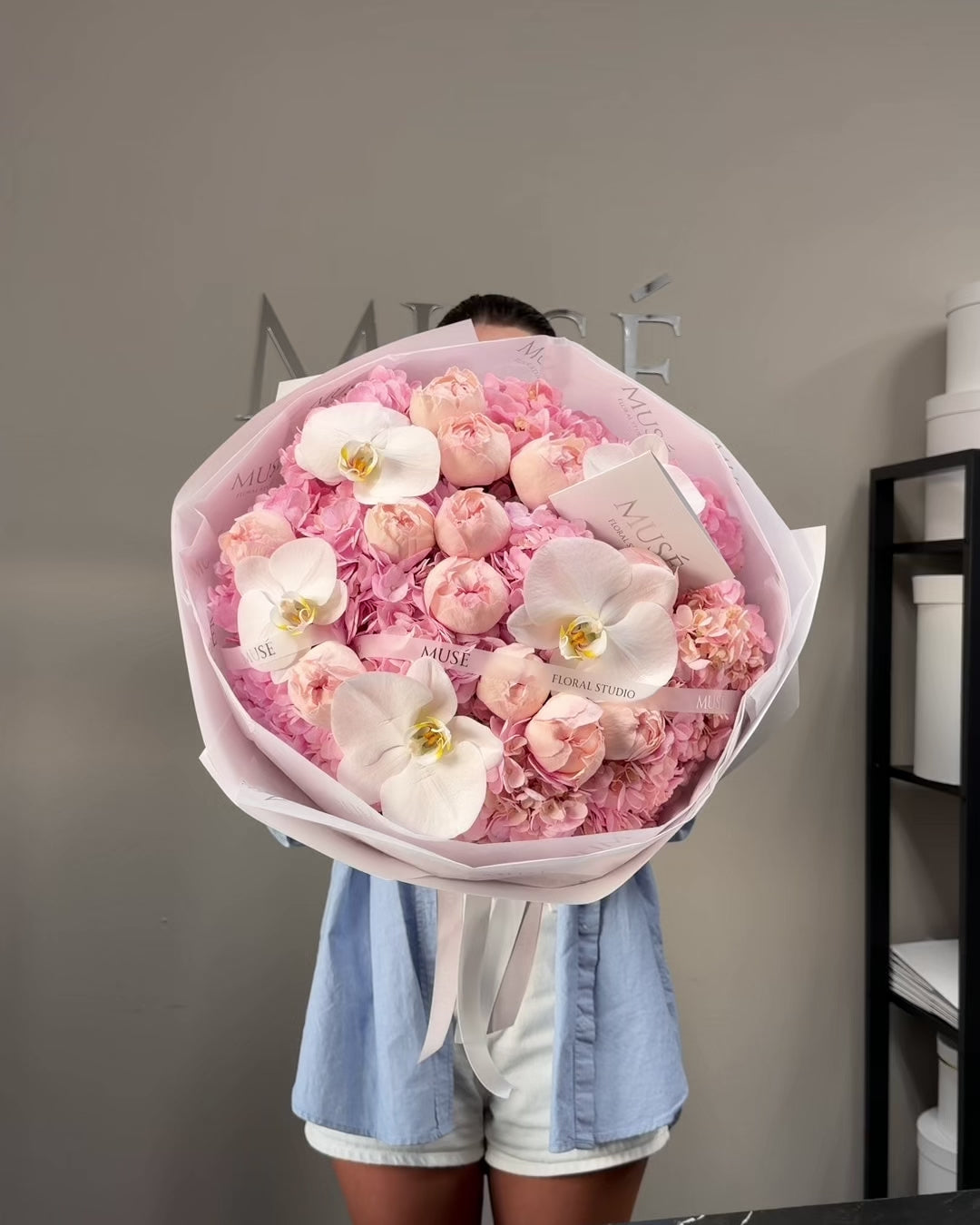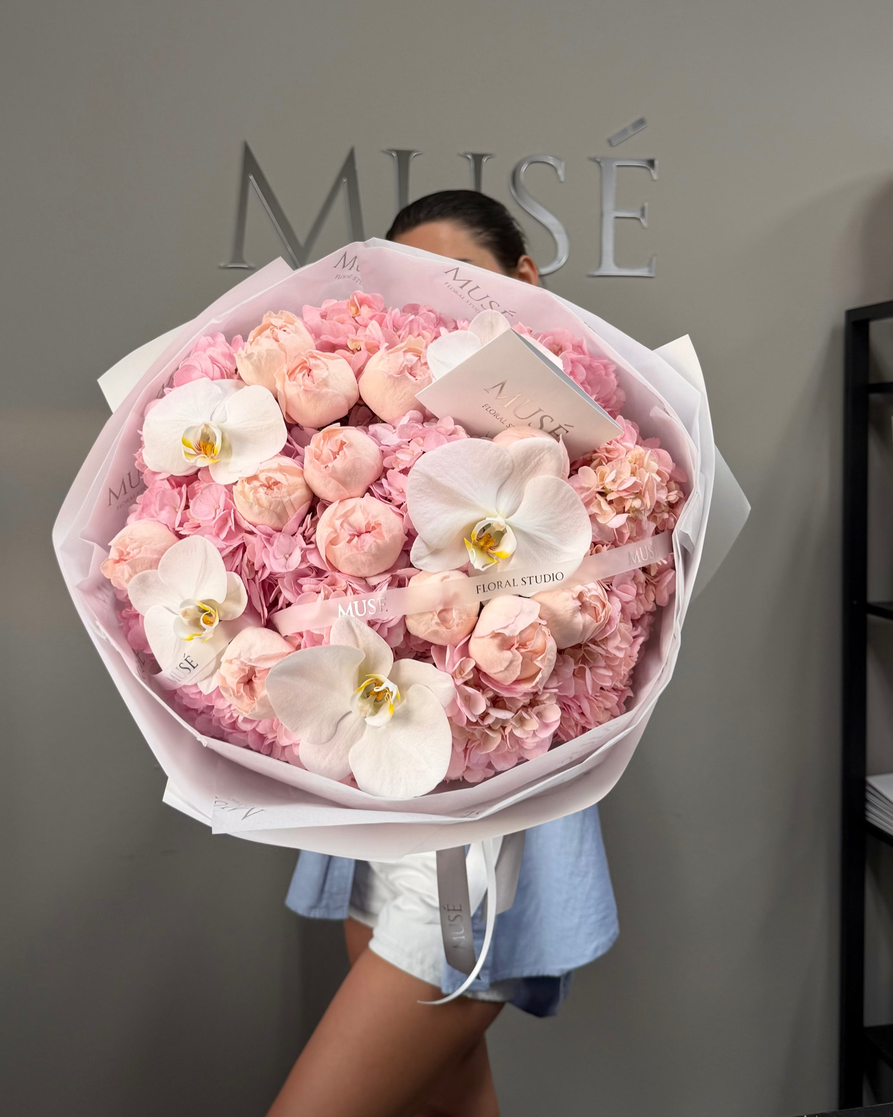 A luxurious pink bouquet featuring hydrangeas, peony-shaped roses, and elegant white orchids. Soft pastel tones, a full rounded shape, and our signature MUSE wrapping create a refined, premium look.